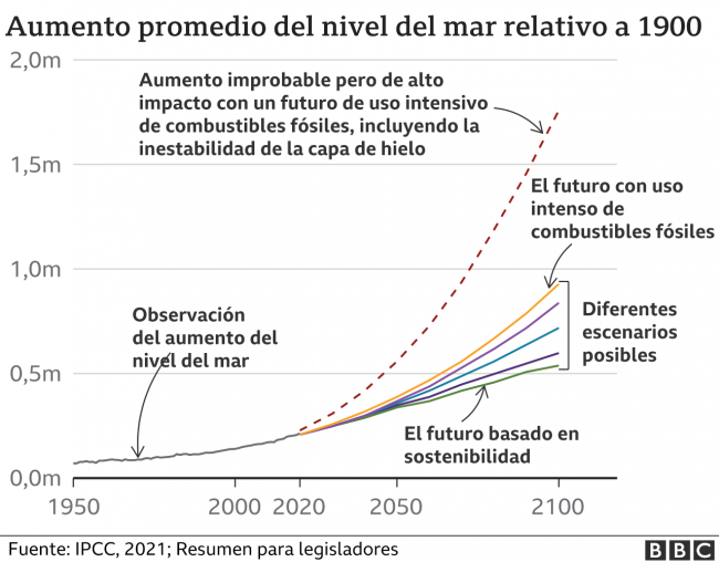 El Panel Intergubernamental de Expertos sobre el Cambio Climático (IPCC, por sus siglas en inglés) evaluó cómo el calentamiento global cambiará el mundo en las próximas décadas tras examinar más de 14.000 artículos científicos. Según los autores, las emisiones continuas de gases de efecto invernadero podrían quebrar un límite clave de la temperatura global en poco más de una década. También creen que «no es posible descartar» una subida del nivel del mar que se acerque a los 2 metros a finales de este siglo.