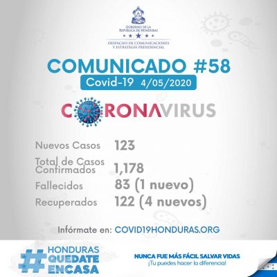El Sistema Nacional de Riesgo, (Sinager), informó mediante Cadena Nacional que el número de infectados por Covid-19 en Honduras es de 1178. Esto, ya que hubo 123 nuevos casos este día.