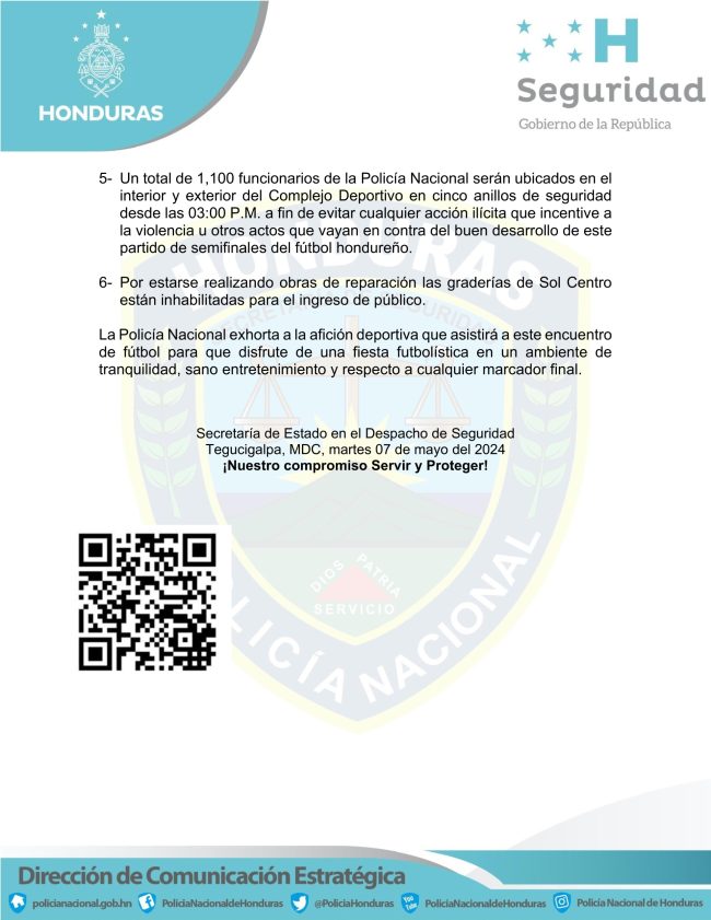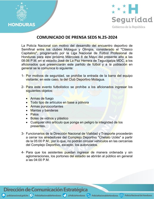 Mediante un comunicado, autoridades de la Policía Nacional informan a la población que desde las 5:00 PM permancerán cerrados los accesos al Estadio Nacional por el clásico capitalino Olimpia – Motagua programado para hoy.