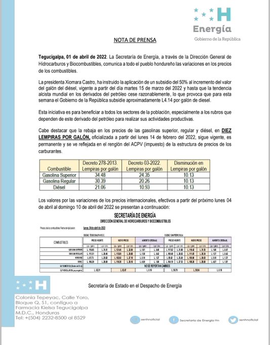 La presidenta Xiomara Castro, ha instruido la aplicación de un subsidio del 50% al incremento del valor del galón del diésel, vigente a partir del día martes 15 de marzo del 2022 y hasta que la tendencia alcista mundial en los derivados del petróleo cese razonablemente, lo que provoca que para esta semana el Gobierno de la República subsidie aproximadamente L4.14 por galón de diesel.