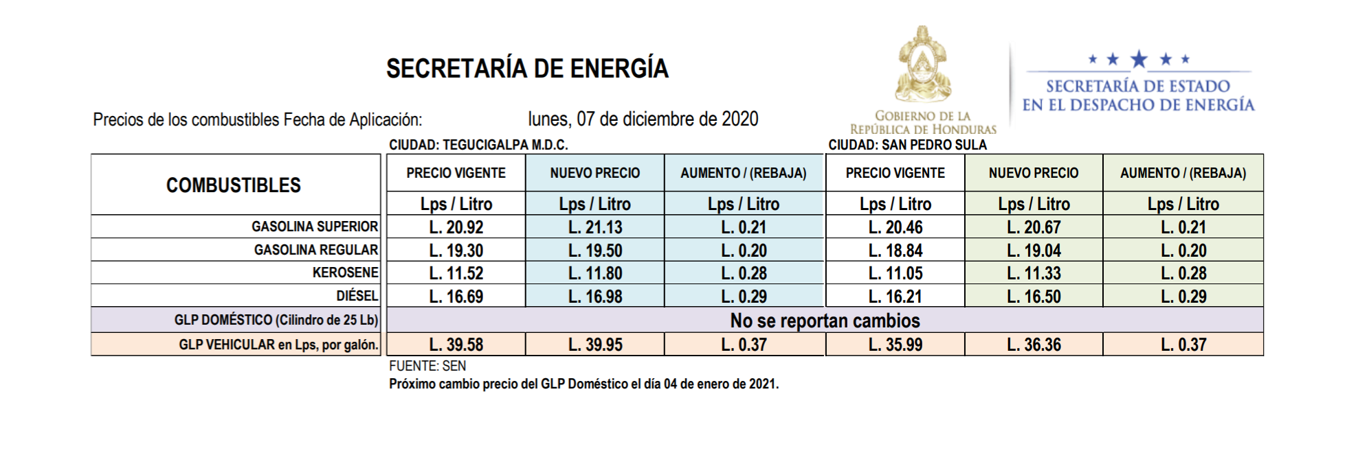 Gasolina superior L20.67, gasolina regular L19.04, keroseno L11.33, diésel L16.50 y LPG vehicular L36.36.
