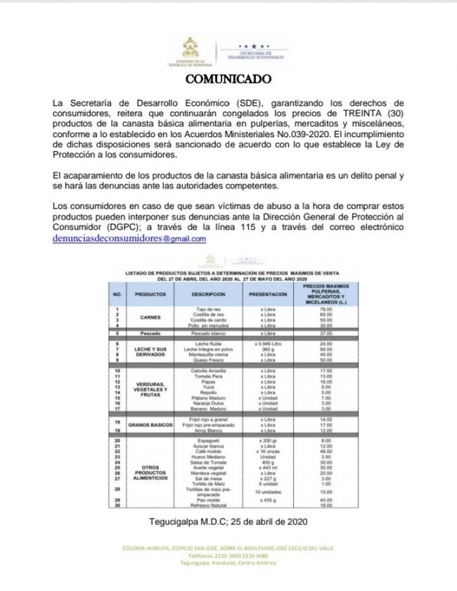 A través de un comunicado  La Secretaria de Desarrollo Económico (SDE) informo este sábado, a la población hondureña,  que han acordado el congelamiento de precios en mercaditos y pulperias.