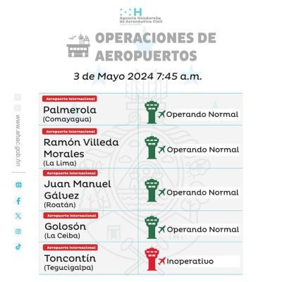 Según informes de Aeronáutica Civil de Honduras, el Aeropuerto de Palmerola en Comayagua, el Ramón Villeda Morales en La Lima Cortés, y el Juan Manuel Gálvez en Roatán están operando de manera habitual. De igual manera, el aeropuerto Golosón en La Ceiba está funcionando sin contratiempos.