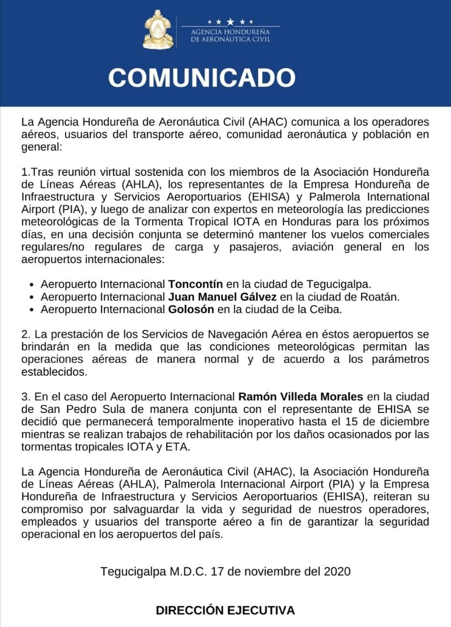 El texto detalla que tras reunión virtual sostenida con los miembros de la Asociación Hondureña de Líneas Aéreas (AHLA), los representantes de la Empresa Hondureña de Infraestructura y Servicios Aeroportuarios (EHISA) y Palmerola International Airport (PIA), y luego de analizar con expertos en meteorología las predicciones meteorológicas de la Tormenta Tropical IOTA en Honduras para los próximos días determinaron tomar dicha decisión.