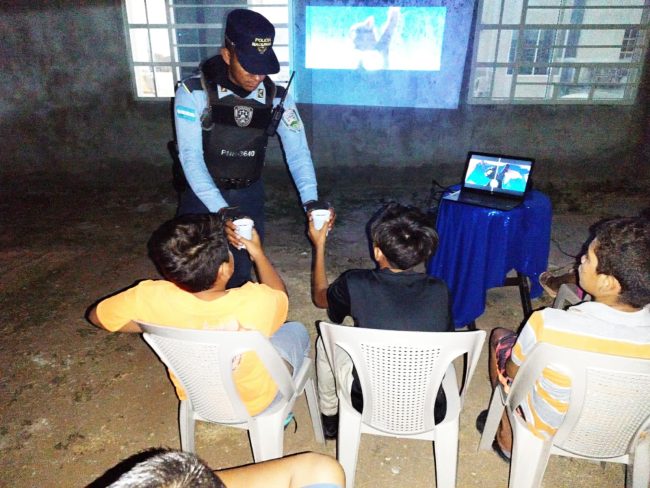 Funcionarios policiales de la Dirección Nacional de Prevención y Seguridad Comunitaria (DNPSC), ejecutaron en las últimas horas un cine comunitario en aldea El Caimito sector intervenido por la Policía Nacional.