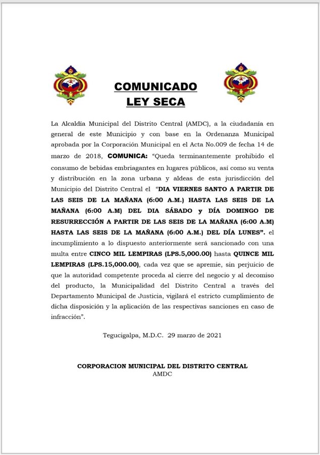 El documento informa a la ciudadanía en general, que “Queda terminantemente prohibido el consumo de bebidas embriagantes en lugares públicos, así como su venta y distribución en la zona urbana y aldeas de esta jurisdicción del Municipio del Distrito Central el “DIA VIERNES SANTO A PARTIR DE LAS SEIS DE LA MAÑANA (6:00 A.M.) HASTA LAS SEIS DE LA MAÑANA (6:00 A.M) DEL DIA SÁBADO y DÍA DOMINGO DE RESURRECCIÓN A PARTIR DE LAS SEIS DE LA MAÑANA (6:00 A.M) HASTA LAS SEIS DE LA MAÑANA (6:00 A.M.) DEL DÍA LUNES”.