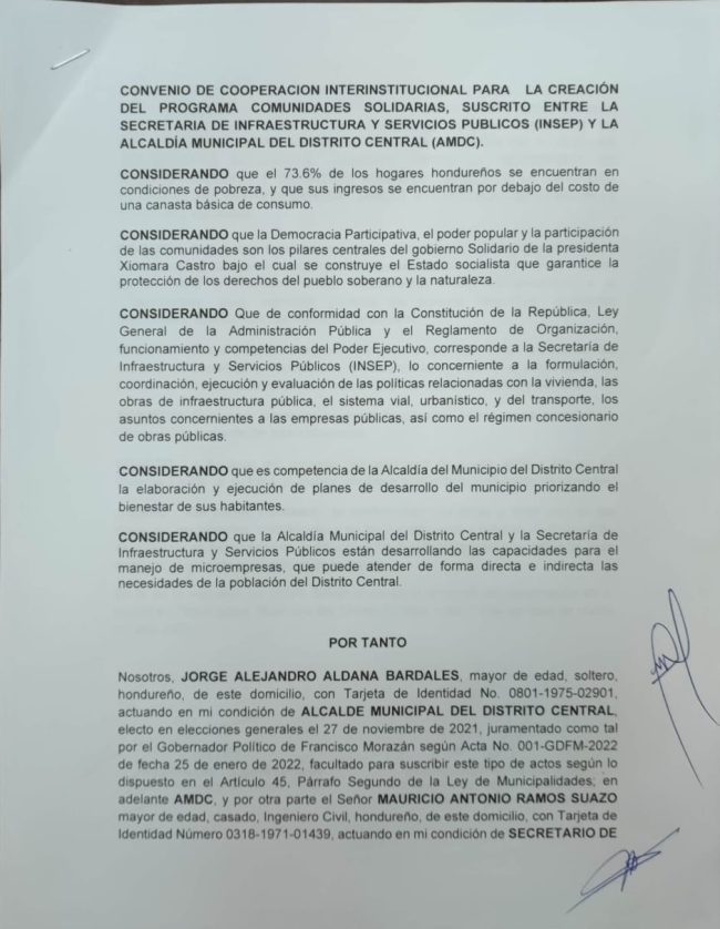 Hoy, con Mauricio Ramos hemos firmado un convenio interinstitucional entre @Insephn2020 y @Alcaldiadchn con la finalidad de que poco a poco generemos entre 4,000 a 5,000 empleos bajo el programa: “Comunidades Solidarias”. pic.twitter.com/Na0mV966ua