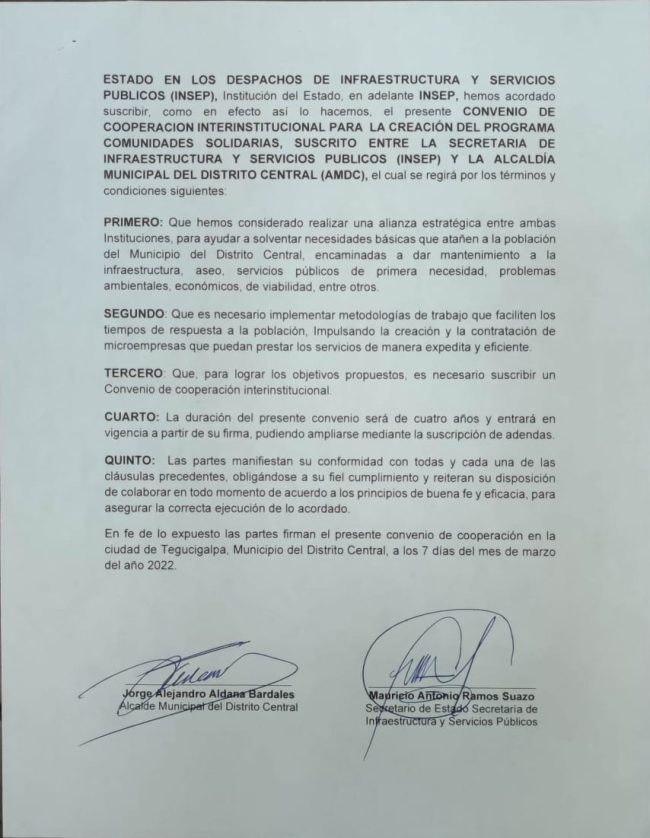 Este lunes 7 de marzo, la Alcaldía Municipal del Distrito Central (AMDC) y la Secretaría de Infraestructura y Servicios (Insep) firmaron un convenio de cooperación para la creación de al menos 5,000 empleos.