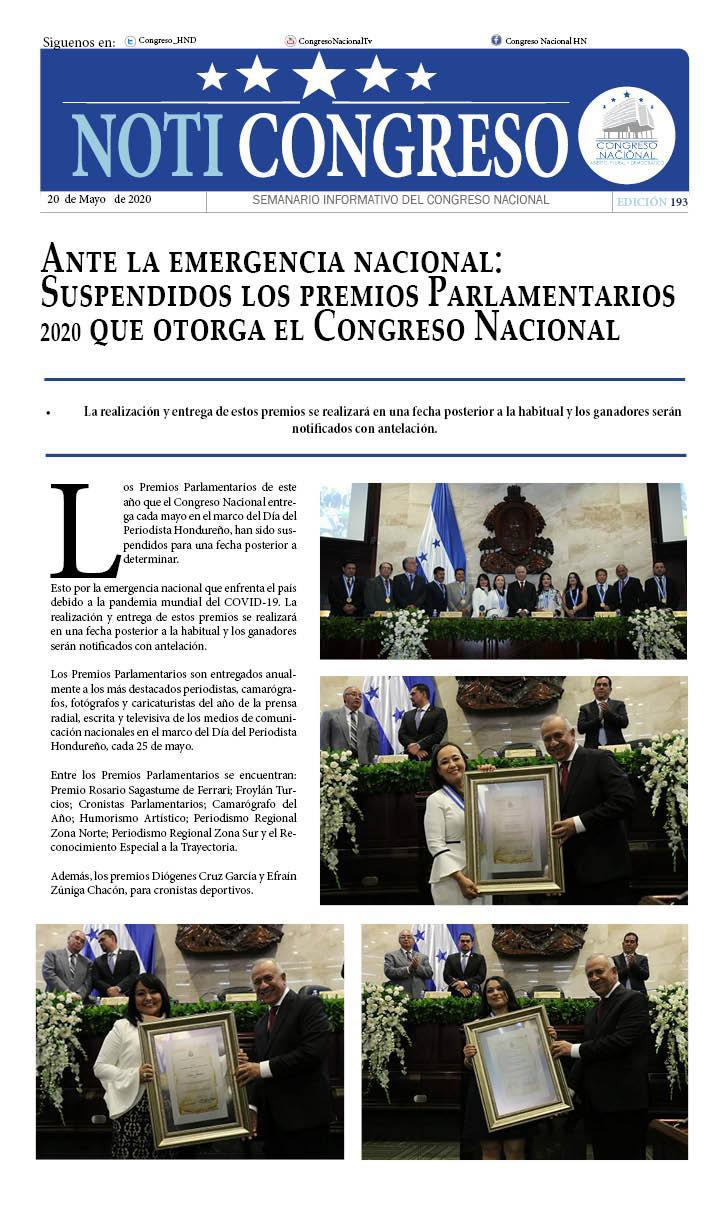 Los Premios Parlamentarios que el Congreso Nacional entrega cada mayo en el marco del Día del Periodista Hondureño de este año han sido suspendidos para una fecha posterior a determinar.