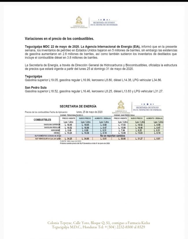 Gasolina superior L19.05, gasolina regular L16.99, keroseno L8.80, diésel L14.38, LPG vehicular L34.86.