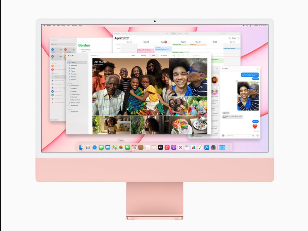 Se presentó una nueva iMac con el nuevo chip M1, que es híper delgada y viene en 7 colores brillantes: verde, amarillo, naranja, rosa, púrpura, azul y plateado. Tiene apenas 11,5 mm de grosor y un 50% del tamaño de la versión anterior: mayor potencia en un envase más compacto. Este nuevo modelo cuenta con una pantalla Retina de 4,5K de 24 pulgadas con 11,3 millones de píxeles y 500 nits de brillo.