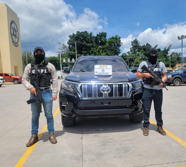 Al momento que el sospechoso fue requerido por los uniformados, se le encontró en poder de un vehículo tipo camioneta de lujo, modelo Prado, marca Toyota, color negro, sin placas, valorado en aproximadamente un millón 400 mil lempiras.