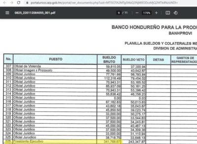 Para el caso, la Ex Presidenta del Banhprovi, Mayra Falk, según planilla de Sueldos y Salarios del Portal Único de Transparencia de diciembre de 2021, devengó L341,768.67. En este sentido, el nuevo titular de este banco de primer piso, Edwin Araque, ganará una suma similar; convirtiéndose a partir de su nombramiento en el hondureño mejor pagado en la administración pública.