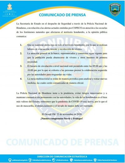 La Secretaría de Estado en el despacho de Seguridad a través de la Policía Nacional de Honduras, con relación a la alertas actuales emitidas por COPECO en atención a las secuelas de los fenómenos naturales que afectaron el territorio hondureño, a la opinión pública comunica:
