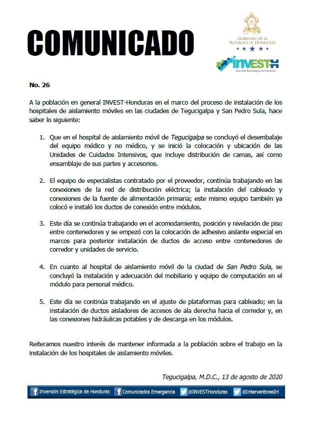 Los trabajos de instalación de Hospitales Móviles avanzan a la segunda fase en Tegucigalpa y San Pedro Sula,   esto de acuerdo a un comunicado emitido este jueves 13 de agosto  por la empresa Inversiones Estratégicas de Honduras (INVEST-H)