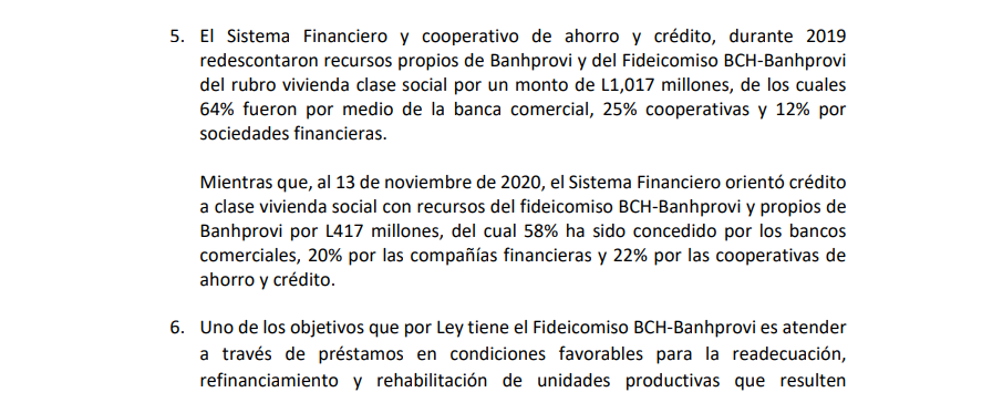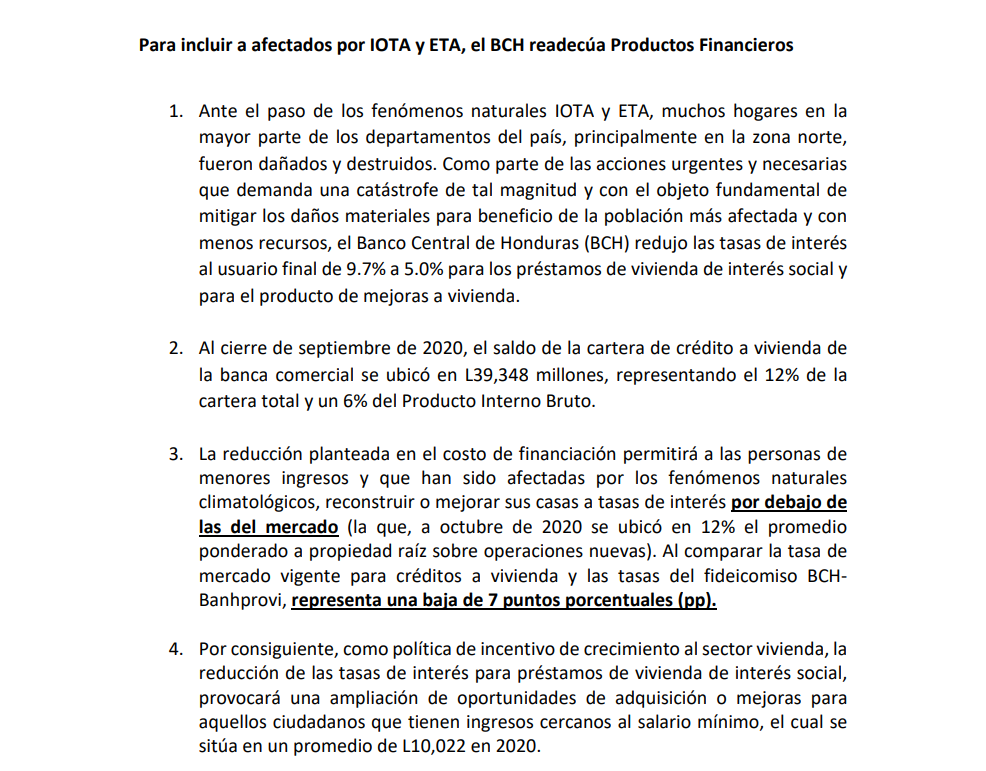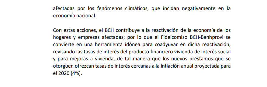 La reducción planteada en el costo de financiación permitirá a las personas de menores ingresos y que han sido afectadas por los fenómenos naturales climatológicos, reconstruir o mejorar sus casas a tasas de interés por debajo de las del mercado (la que, a octubre de 2020 se ubicó en 12% el promedio ponderado a propiedad raíz sobre operaciones nuevas). Al comparar la tasa de mercado vigente para créditos a vivienda y las tasas del fideicomiso BCH-Banhprovi, representa una baja de 7 puntos porcentuales (pp).