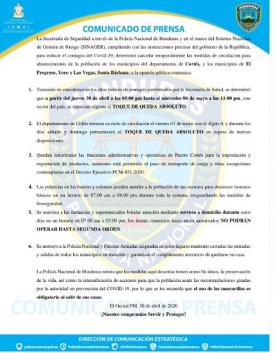 TEGUCIGALPA, HONDURAS. La Secretaría de Seguridad determinó cancelar las medidas de circulación para abastecimiento de la población de los municipios del departamento de Cortés, y los municipios de El Progreso, Yoro y Las Vegas, Santa Bárbara para evitar propagación de COVID-19.