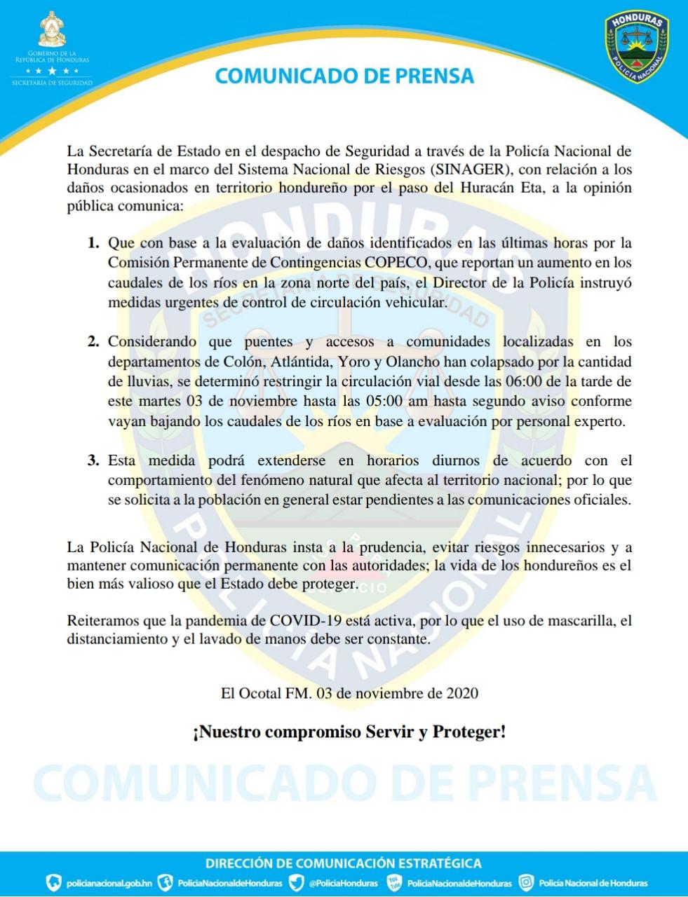 La Secretaría de Estado en el despacho de Seguridad a través de la Policía Nacional de Honduras en el marco del Sistema Nacional de Riesgo (SINAGER), con relación a los daños ocasionados en territorio hondureño por el paso del Huracán Eta, decidió cancelar la circulación vial en los departamentos de Colón, Atlántida, Yoro y Olancho.