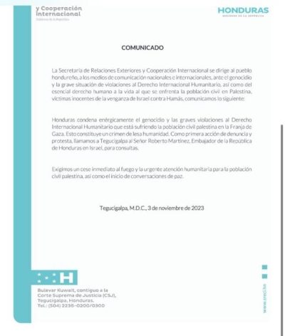 Mediante redes sociales, el canciller Eduardo Enrique Reina informó que «ante la grave situación humanitaria que sufre la población civil palestina en la franja de Gaza, el gobierno de la presidenta Xiomara Castro ha decidido llamar inmediatamente a consultas a Tegucigalpa al señor Roberto Martínez, embajador de la República de Honduras en Israel».