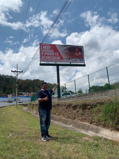 El líder de «Peleando Mona», en una acción socialmente responsable tuvo la genial idea de ubicar esta publicidad junto a uno de sus patrocinadores y de esta forma generar conciencia en la población hondureña ya que en los últimos dias se han incrementado las muertes en accidentes de tránsito.