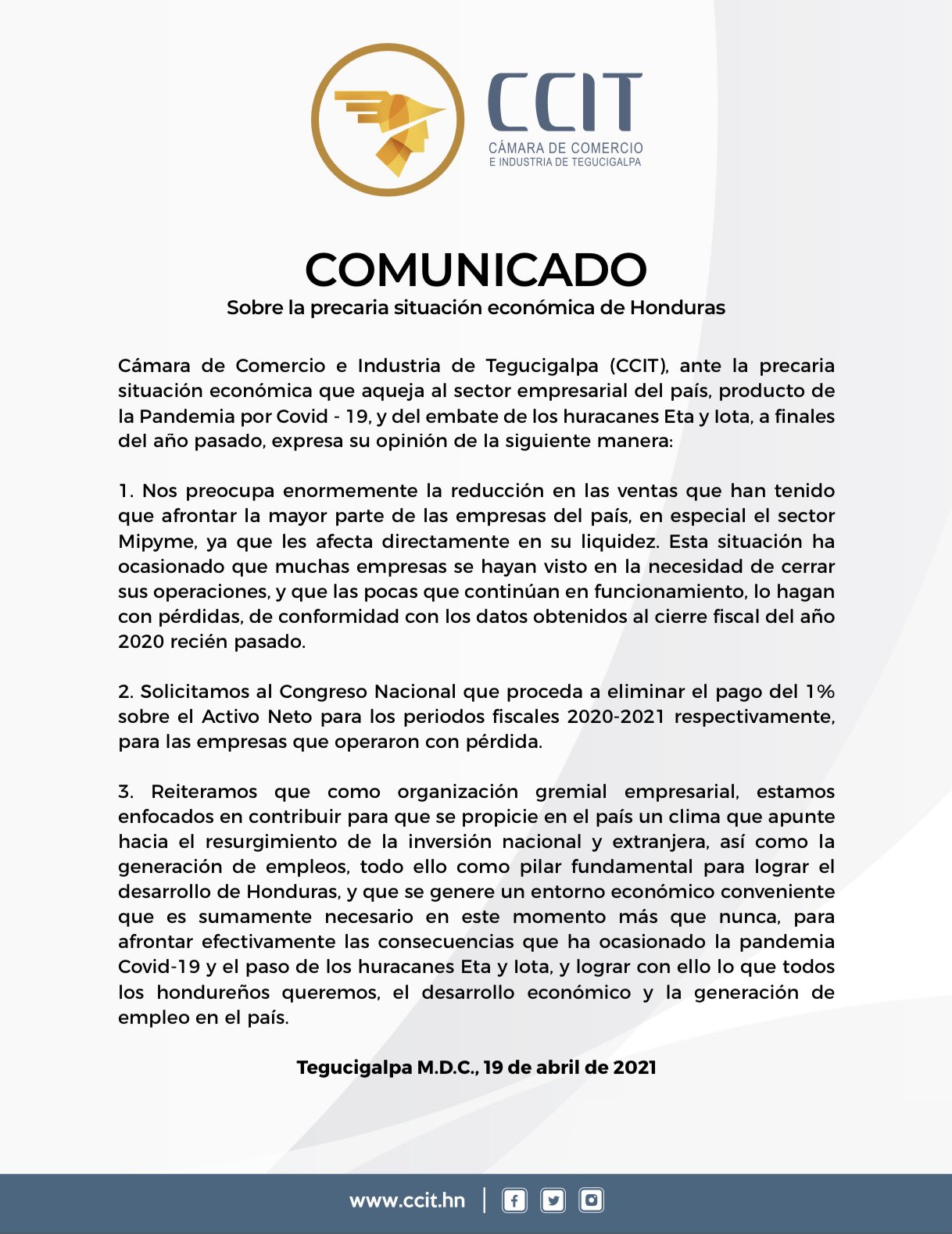 Tegucigalpa, Honduras. Severamente golpeados por la pandemia del Covid19, y devastados por las dos tormentas tropicales Eta y Iota, la Cámara de Comercio e Industrias de Tegucigalpa (CCIT), solicitó al Congreso Nacional la eliminación del pago el 1 por ciento sobre el activo neto de los períodos fiscales 2020-2021.