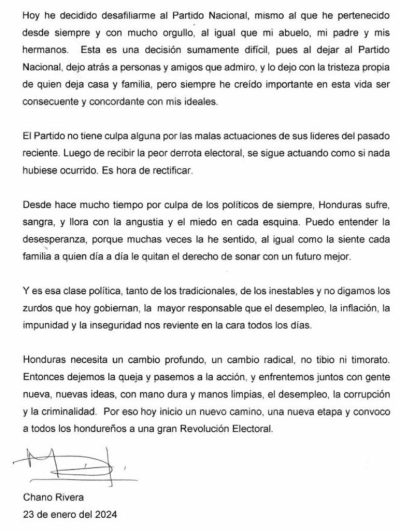 Hoy he decidido desafiliarme al Partido Nacional, mismo al que he pertenecido desde siempre y con mucho orgullo, al igual que mi abuelo, mi padre y mis hermanos. Esta es una decisión sumamente dificil, pues al dejar al Partido Nacional, dejo atrás a personas y amigos que admiro, y lo dejo con la tristeza propia de quien deja casa y familia, pero siempre he creído importante en esta vida ser consecuente y concordante con mis ideales.