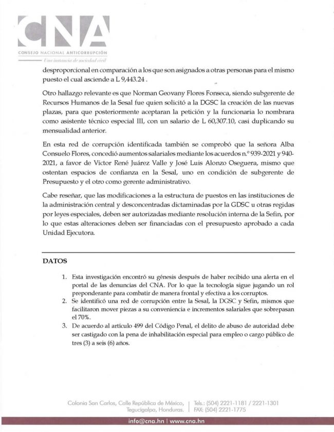 El Consejo Nacional Anticorrupción (CNA), reveló hoy la investigación favoritismo en otorgamiento de plazas y aumentos salariales e interpuso una denuncia por cinco delitos de abuso de autoridad en contra de la actual ministra de Salud, Alba Consuelo Flores.