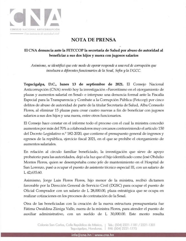 El Consejo Nacional Anticorrupción (CNA), reveló hoy la investigación favoritismo en otorgamiento de plazas y aumentos salariales e interpuso una denuncia por cinco delitos de abuso de autoridad en contra de la actual ministra de Salud, Alba Consuelo Flores.