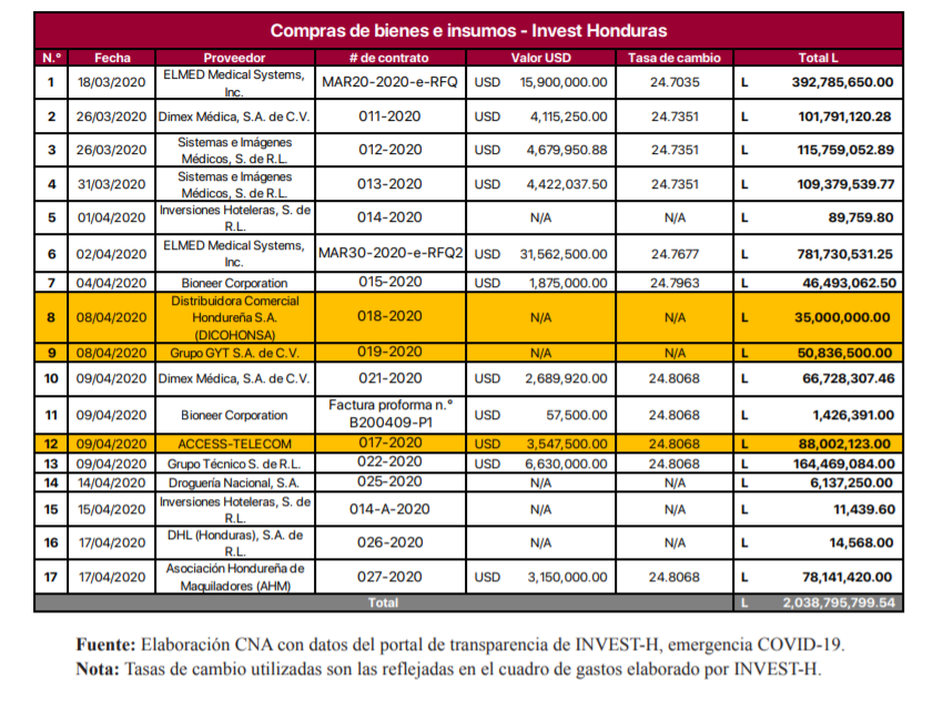 El 8 de abril de 2020, por medio de la orden de compra n.º 018-2020 se aprobó la adquisición a la Distribuidora Comercial Hondureña, S.A. (DICOHONSA), de doscientos cincuenta mil (250,000) mascarillas N95, a un valor unitario de ciento cuarenta lempiras (L 140.00), siendo el valor total de la compra treinta y cinco millones de lempiras (L 35,000,000.00).
