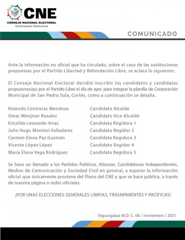 El en documento el CNE, comunica que los candidatos y candidatas a la alcaldía de San Pedro Sula propuestos por Libre han sido oficialmente inscritos para participar en los comicios electorales.