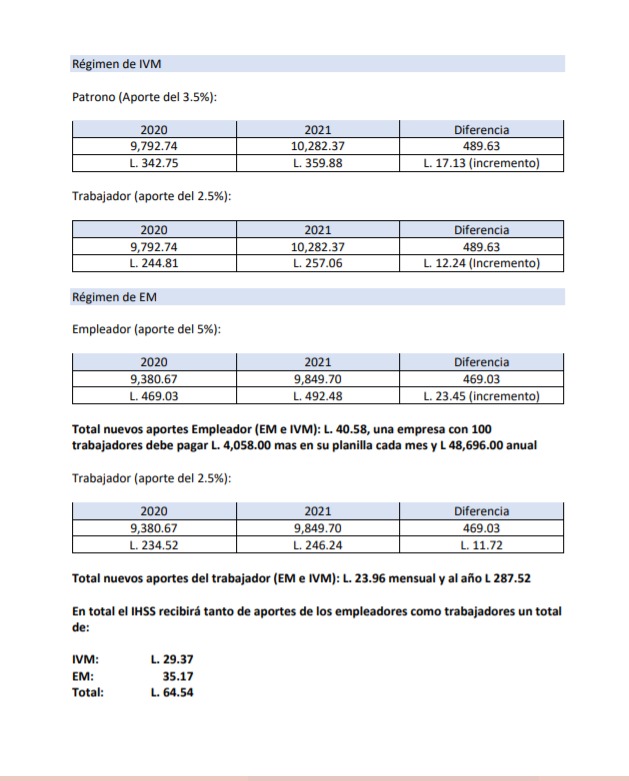- Régimen de Seguro de Atención a la Salud (Enfermedad y Maternidad), una contribución equivalente al 5% Empleador y 2.5% el Trabajador, en base a un techo máximo de cotización equivalente a L 9,849.70;