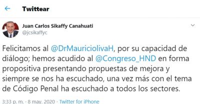 TEGUCIGALPA, HONDURAS. El presidente del Consejo Hondureño de la Empresa Privada (Cohep), Juan Carlos Sikaffy, felicitó a través de su cuenta de Twitter al titular del Congreso Nacional (CN), Mauricio Oliva, por su voluntad de escuchar a los diferentes sectores.