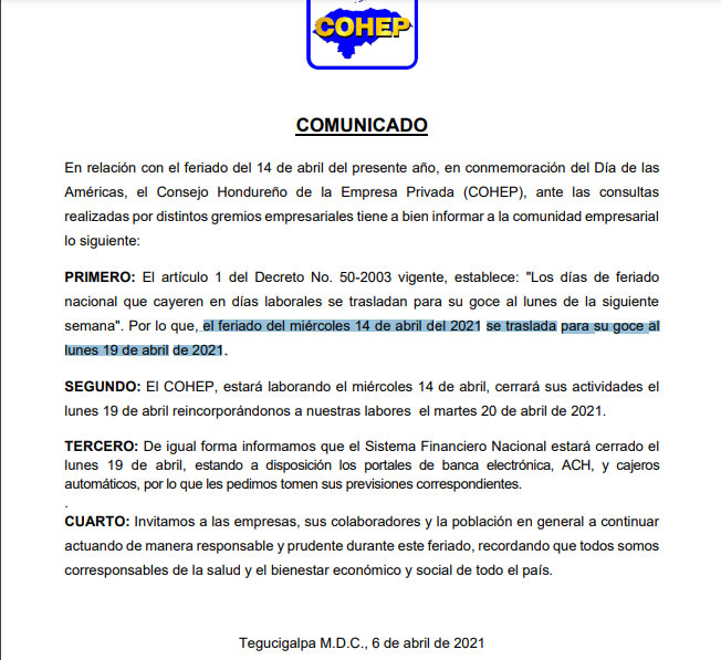 Tegucigalpa, Honduras. Mediante un comunicado oficial, el Consejo Hondureño de la Empresa Privada (Cohep), decidió trasladar feriado del Día de las Américas 14 de abril al 19 de abril de 2020.