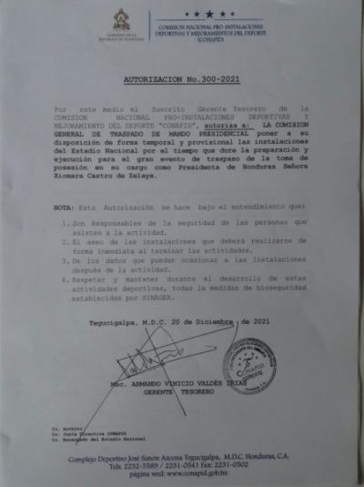 Tegucigalpa, Honduras. La Comisión Nacional Pro Instalaciones Deportivas (Conapid) puso este martes a disposición de la Comisión de Traspaso de Mando Presidencial las instalaciones del Estadio Nacional de Tegucigalpa.
