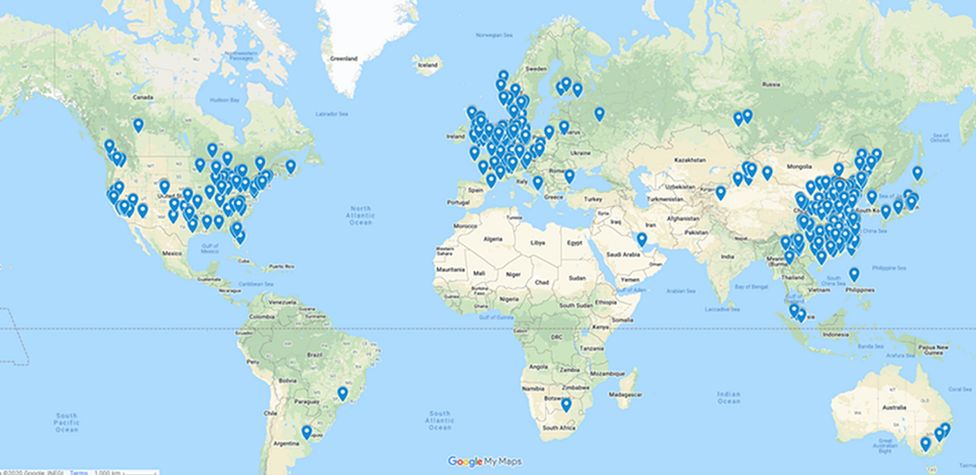 Una muestra de las coordenadas reveladas por los servidores de Cellmates muestra que el dispositivo se ha utilizado en todo el mundo | Cortesía Pen Test Partners