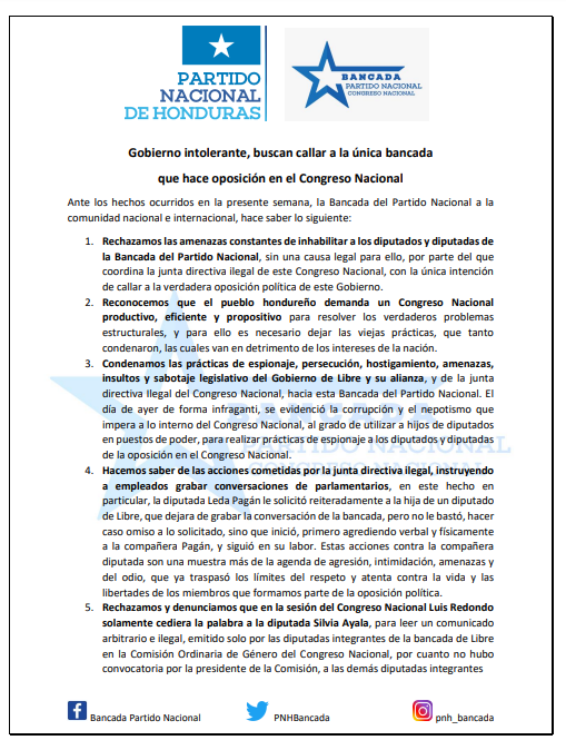 El Partido Nacional de Honduras, emite un comunicado, luego de las amenazas de expulsión, realizadas por el presidente del CN Luis redondo, las cuales mantienen molestos a toda bancada del partido, y expresan «Rechazamos las amenazas constantes de inhabilitar a los diputados y diputadas del Partido Nacional»