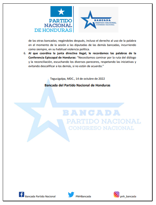 A través de un comunicado, la bancada del Partido Nacional de Honduras (PNH), pide respeto y al mismo tiempo denuncian una campaña de hostigamiento y agresión de parte del Gobierno de la Presidenta Xiomara Castro, por ser el único organismo de oposición.
