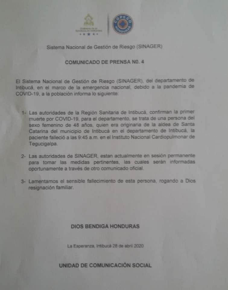 Fuentes del Sistema Nacional de Gestión de Riesgos (Sinager), en Intibucá confirmaron la primera muerte por coronavirus en ese departamento.