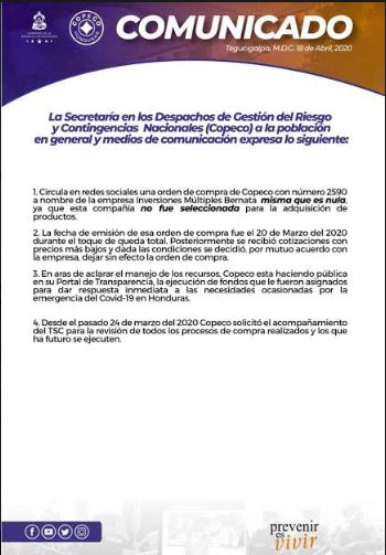 El comunicado citó de forma textual que “circula en las redes sociales una orden de compra de Copeco con número 2590, a nombre de la empresa inversiones múltiples Bernata; misma que es nula, ya que esta compañía no fue seleccionada para la adquisición de productos”.