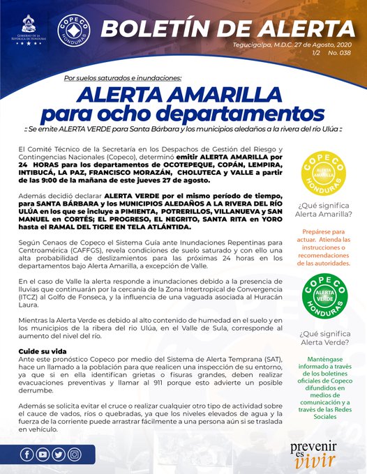 El Comité de Alertas de la Comisión Permanente de Contingencias (Copeco), determinó emitir #AlertaAmarilla para ocho departamentos de Honduras.