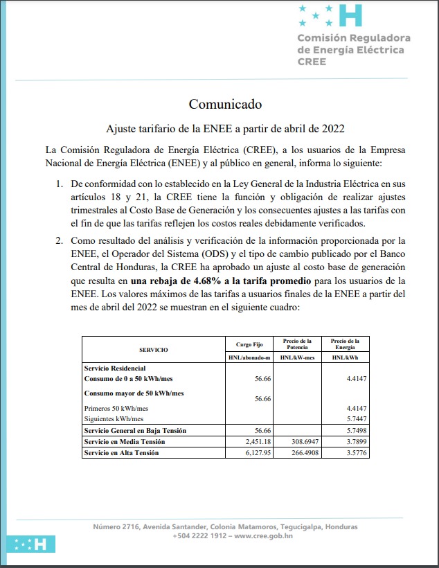 que resulta en una rebaja de 4.68% a la tarifa promedio para los usuarios de la ENEE. Los valores máximos de las tarifas a usuarios finales de la ENEE a partir del mes de abril del 2022 se muestran en el siguiente cuadro: