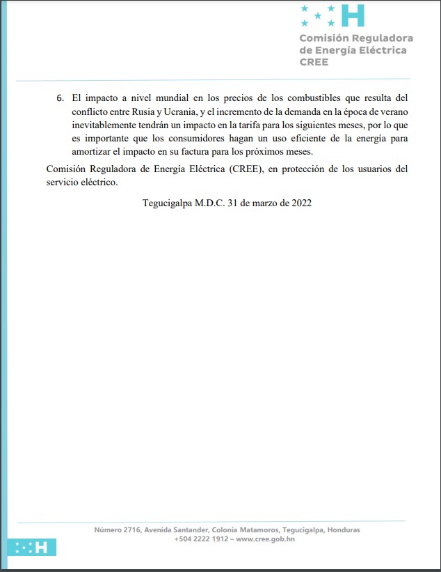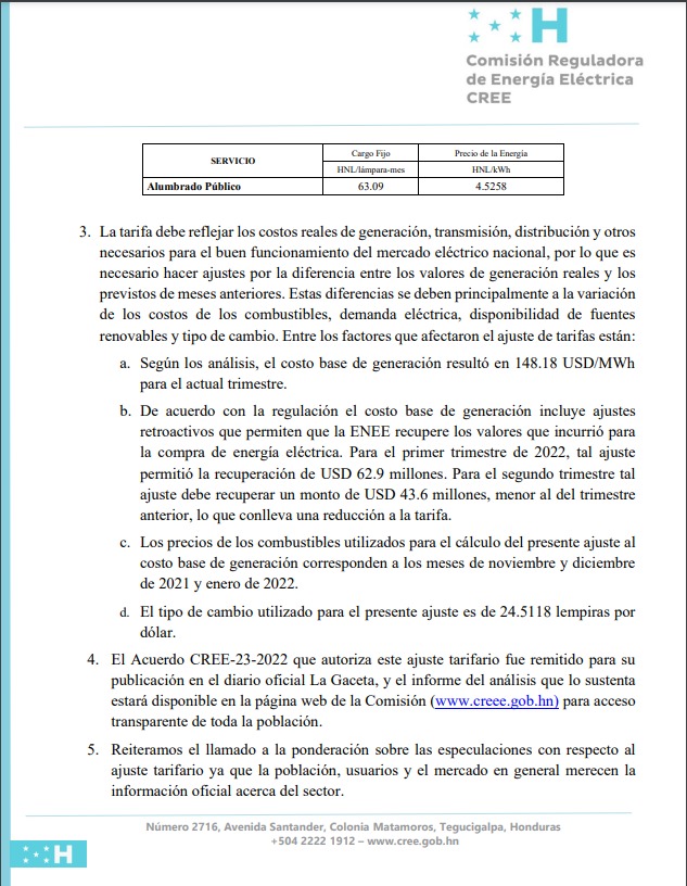 2. Como resultado del análisis y verificación de la información proporcionada por la ENEE, el Operador del Sistema (ODS) y el tipo de cambio publicado por el Banco de Honduras, la CREE ha aprobado un ajuste al costo base de generación