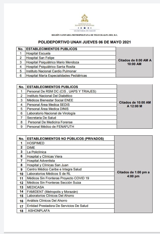 El jefe de la Región Metropolitana de Salud del Distrito Central, doctor Harry Bock, indicó que del 6 al 10 de mayo será la vacunación de los empleados de la salud públicos y no públicos que quedaron pendientes de inocular, la cual se llevará a cabo en el Polideportivo de la Universidad Nacional Autónoma de Honduras (UNAH), con un horario de 8:00 de la mañana a 4:00 de la tarde.