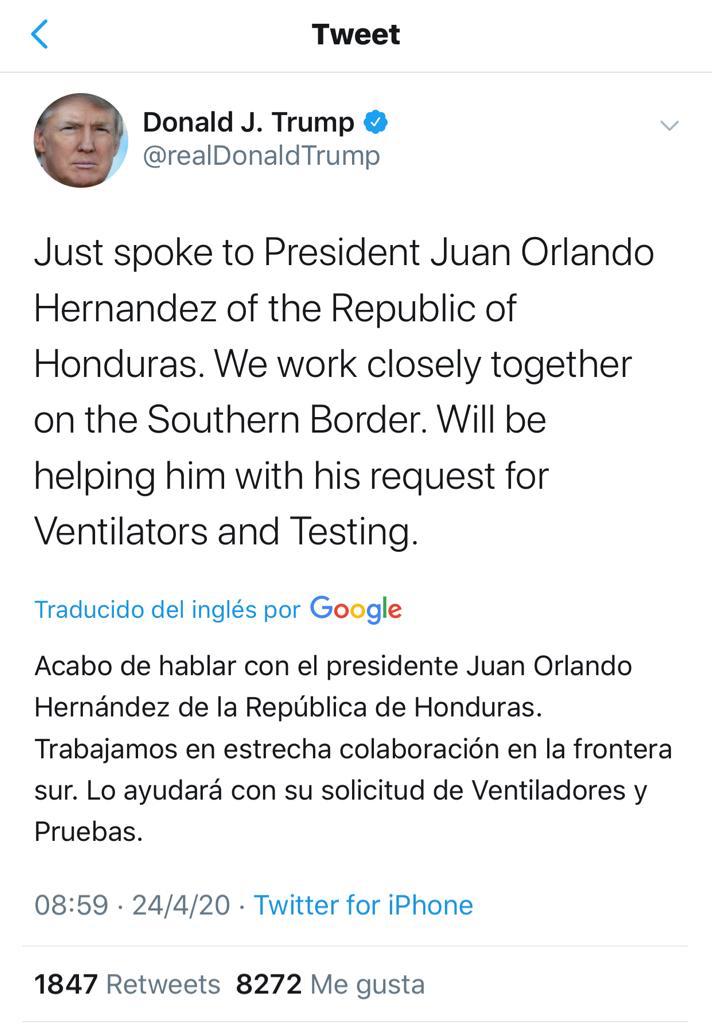 Acabo de hablar con el presidente Juan Orlando Hernández de la República de Honduras. Trabajamos en estrecha colaboración en la frontera sur. Lo ayudará con su solicitud de Ventiladores y Pruebas.