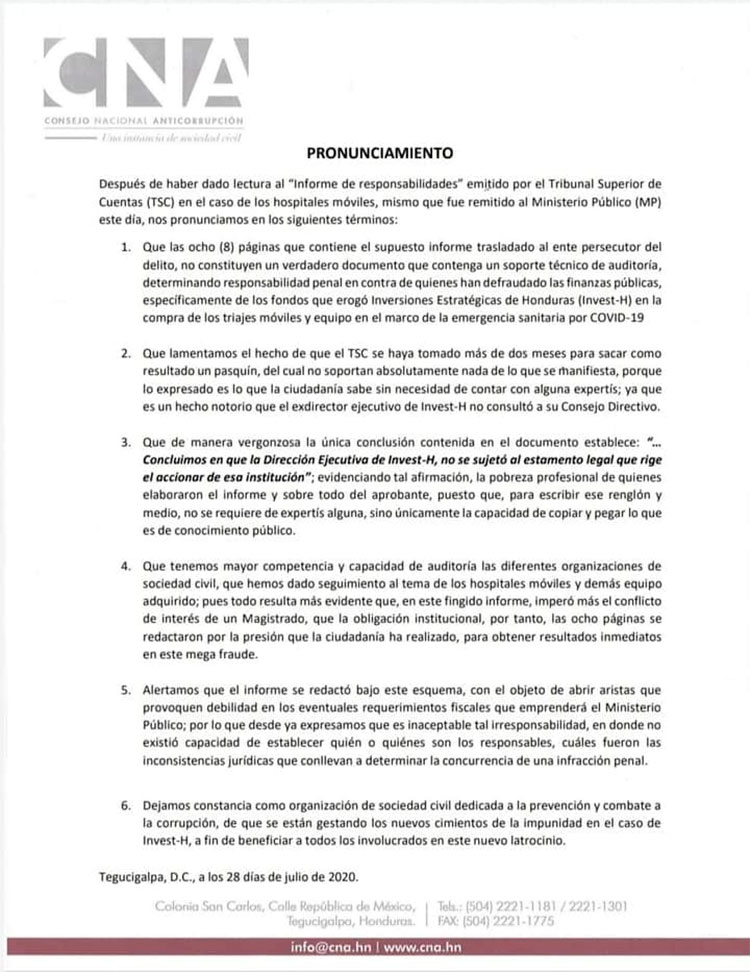 De «pasquín y sin soporte legal» calificaron los representantes del Consejo Nacional Anticorrupcióp (CNA), el informe presentado por el Tribunal Superior de Cuentas (TSC), ante el Ministerio Público.