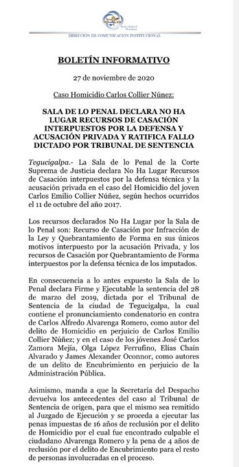 Sala de lo Penal declara No Ha Lugar recursos de Casación interpuestos por la defensa técnica y acusación privada, asimismo ratifica fallo dictado por el Tribunal Sentencia de la ciudad de Tegucigalpa, en el caso del Homicidio de Carlos Collier Núñez.