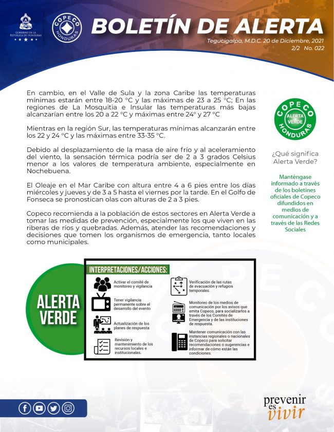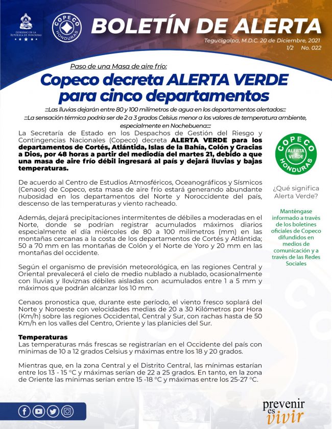 La Secretaría de Estado en los Despachos de Gestión del Riesgo y Contingencias Nacionales (Copeco) decretó Alerta Verde para cinco departamentos del país.