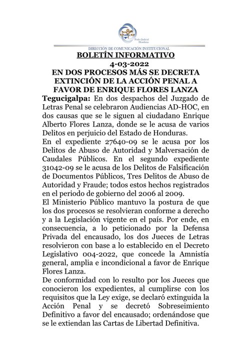 El Juzgado Penal de la ciudad de Tegucigalpa, decretó Extinción de la Acción Penal para el ciudadano Enrique Flores Lanza.