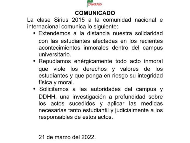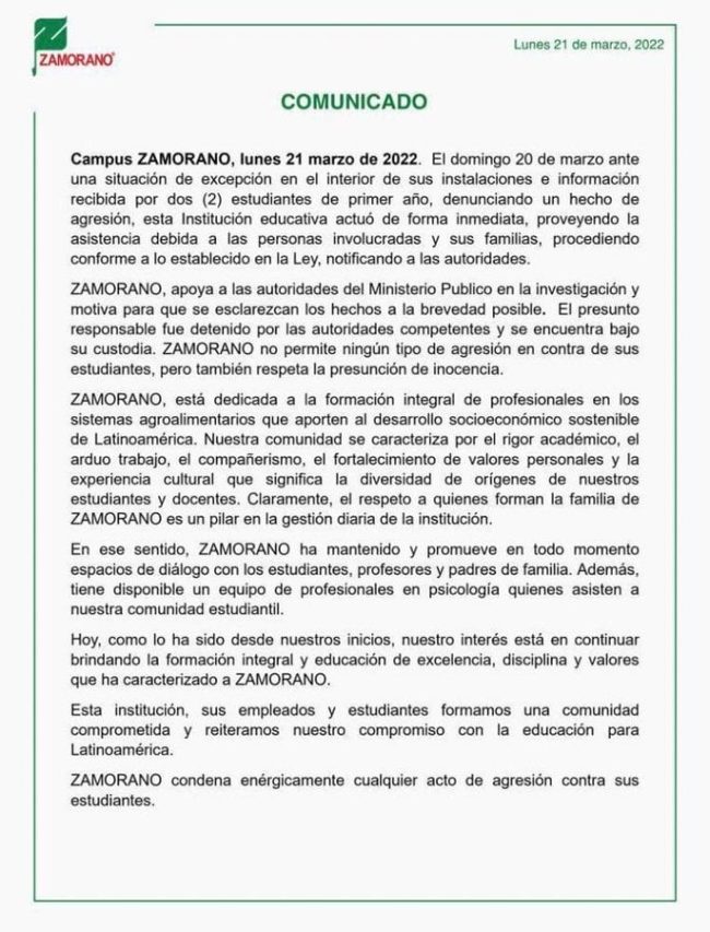 Tras el penoso y alarmante escándalo, autoridades de la Escuela Agrícola Panamericana Zamorano. emitieron un comunicado indicando que se están tomando cartas en el asunto y que se remitió al agresor ante las autoridades de investigación correspondiente para iniciar con el debido proceso.