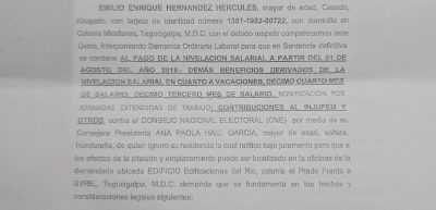 La demanda en mención cita que «Emilio Enrique Hernández Hercules, mayor de edad, Casado, Abogado, con tarjeta de identidad número 1301-1983-00722, con domicilio en Colonia Miraflores, Tegucigalpa, M.D.C. con el debido respeto comparecemos ante Usted, interponiendo Demanda Ordinaria Laboral para que en Sentencia definitiva se condene al pago de la nivelación salarial a partir del 01 de agosto del año 2018.- Demás beneficios derivados de la nivelación salarial en cuanto a vacaciones, decimo cuarto mes de salario: decimo tercer mes de salario, bonificaciones por jornadas extendidas de trabajo: contribuciones al Injupemp y otros, contra el Consejo Nacional Electoral (CNE).»